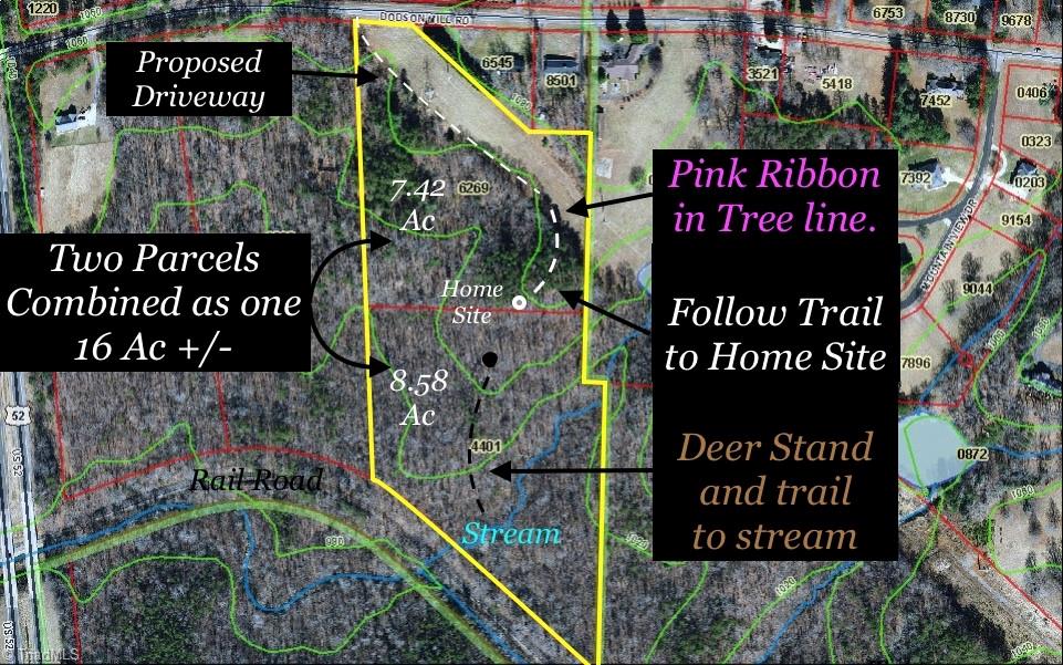16 Ac +/- tract of land in Pilot Mountain with county zoning yet convenient to town and within the ETJ of Pilot Mountain, zoned RA. Mature wooded home-site in secluded location: stream, rock out-croppings and full of wildlife. To view the property, follow tree line along the power easement to the “marked trail” on the right that leads to home-site (check out map in photos). Restricted to “Site-Built”, 1500 square feet for one story and 2000 square feet for a two story – call for additional restrictions.